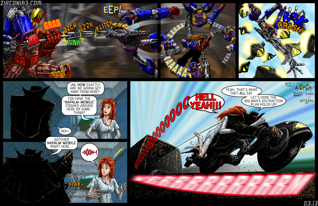 More redrawing. The original isn't too bad, from a distance. Up close, those bottom-left panels, well, I don't know what the hell happened. Looks like something I might have done in high school. Anyway, I completely redrew Miss Waters there, and I feel so much better about having that page out in public now. As for the last big panel-- I can't remember exactly what my thought process was, but I can guess I wasn't confident enough, so I just hid her face there. Can't blame myself after the crap job I did on the pervious 2 panels. Now it's just awesome, if I do say so myself.